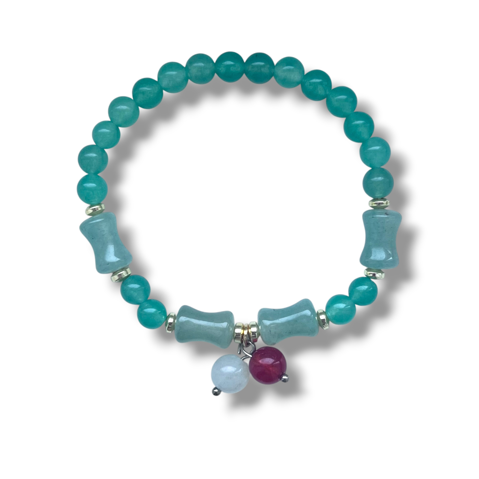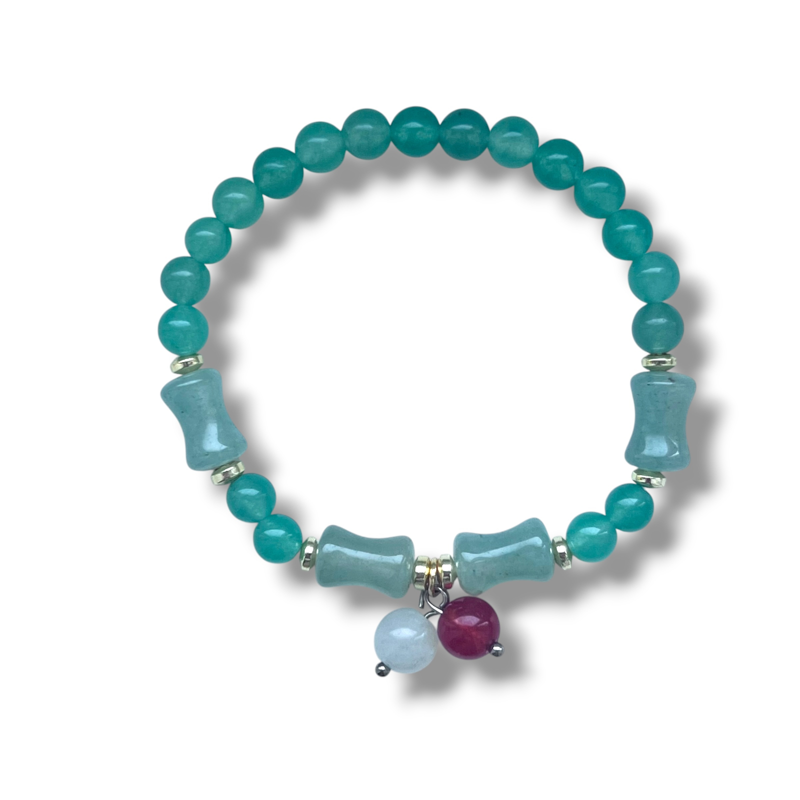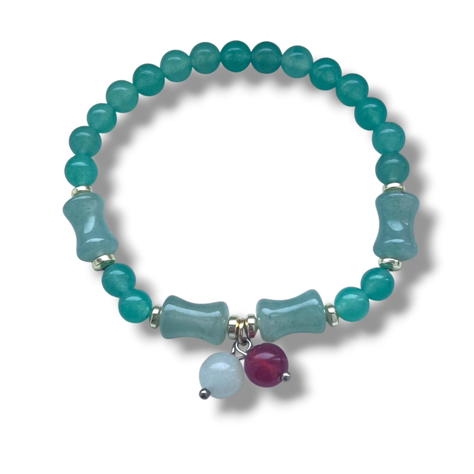 Confecționată manual din pietre naturale de jade verde, această brățară aduce un plus de echilibru interior și prosperitate purtătoarei sale. Elemente decorative atent alese – mărgele fine, detalii metalice argintii și cristale accent în nuanțe delicate de roșu – conferă bijuteriei o armonie vizuală deosebită.