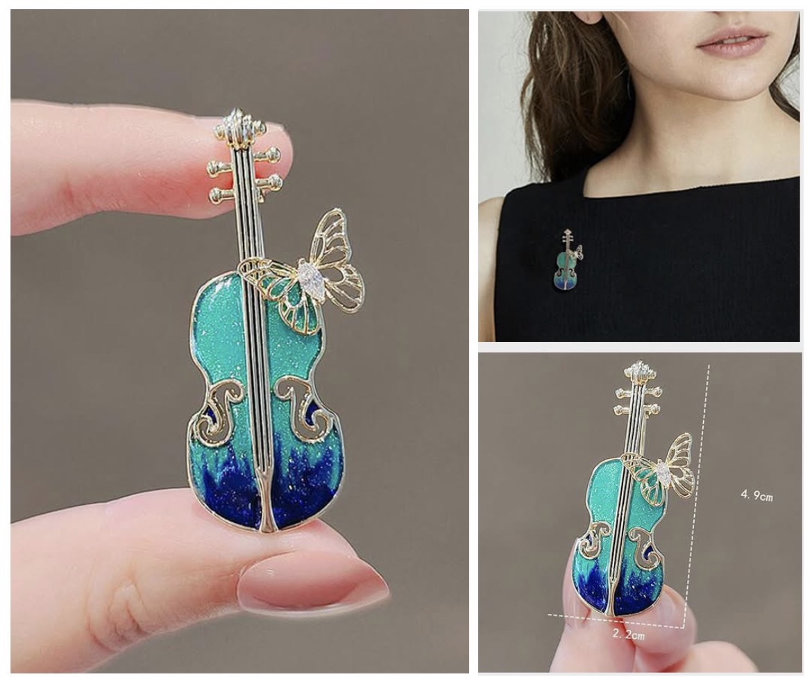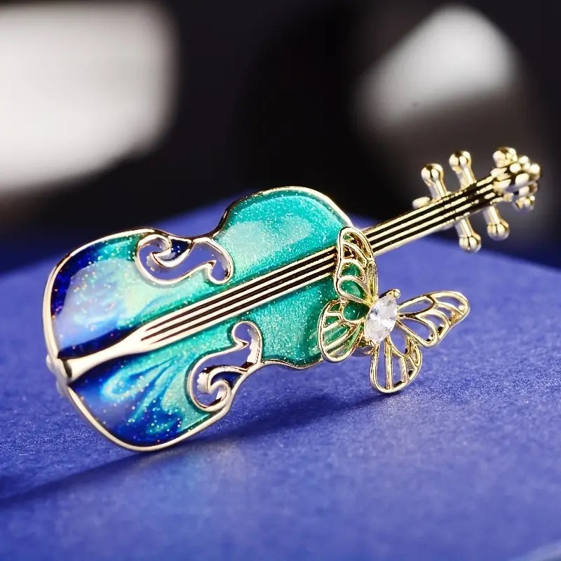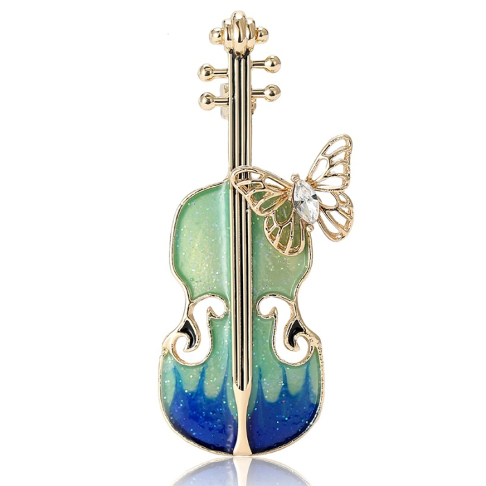 Broșa impresionează prin detaliile atent lucrate: finisaj auriu, email în nuanțe degrade de verde și albastru, accente strălucitoare și un fluture delicat decorat cu cristal. Designul simbolizează armonia, libertatea și eleganța — un cadou ideal pentru femeile care iubesc arta, muzica și stilul sofisticat.