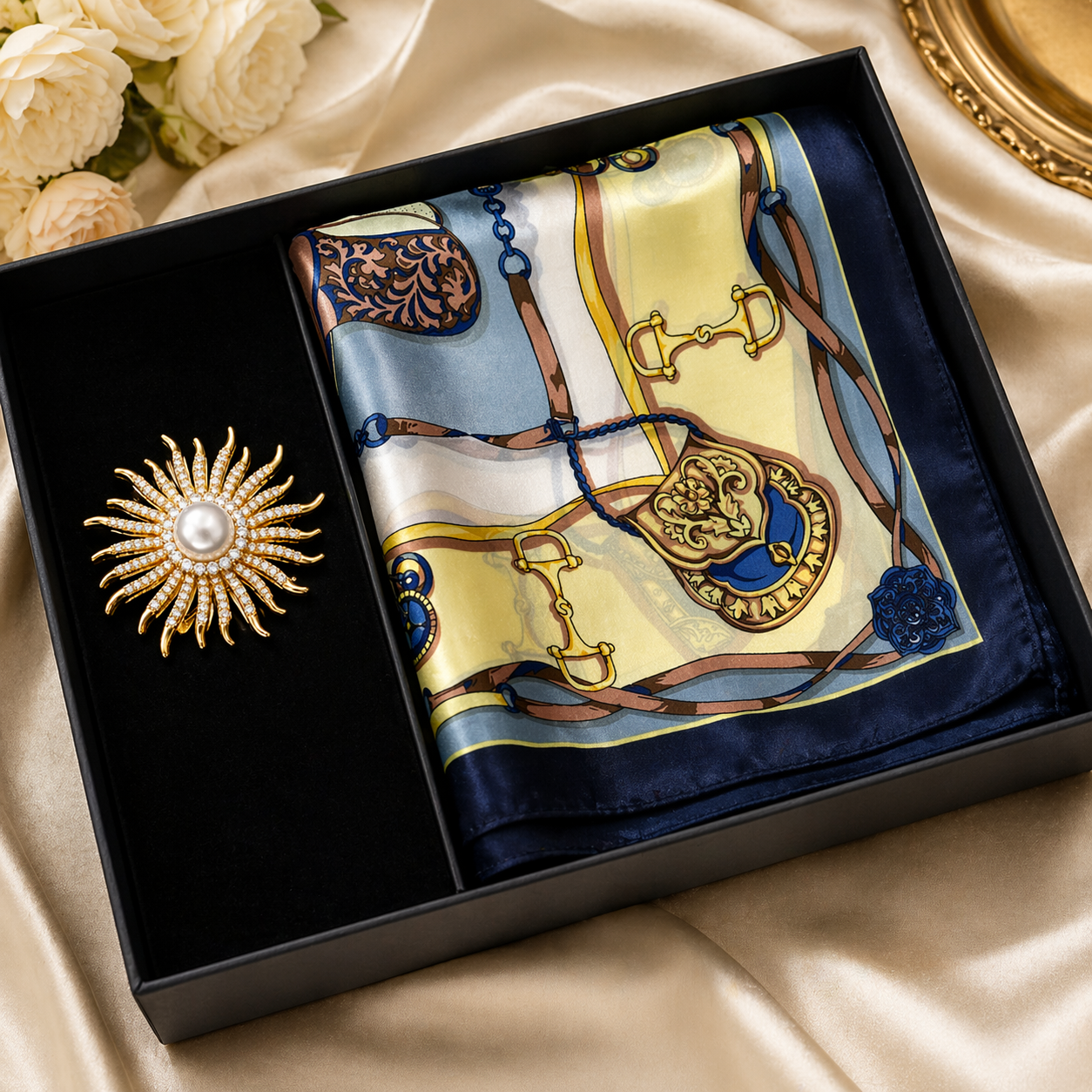 Surprinde cu un cadou sofisticat și plin de stil: un set elegant format dintr-o broșă spectaculoasă cu perlă și o eșarfă din matase, perfectă pentru femeile care apreciază detaliile rafinate și accesoriile deosebite.