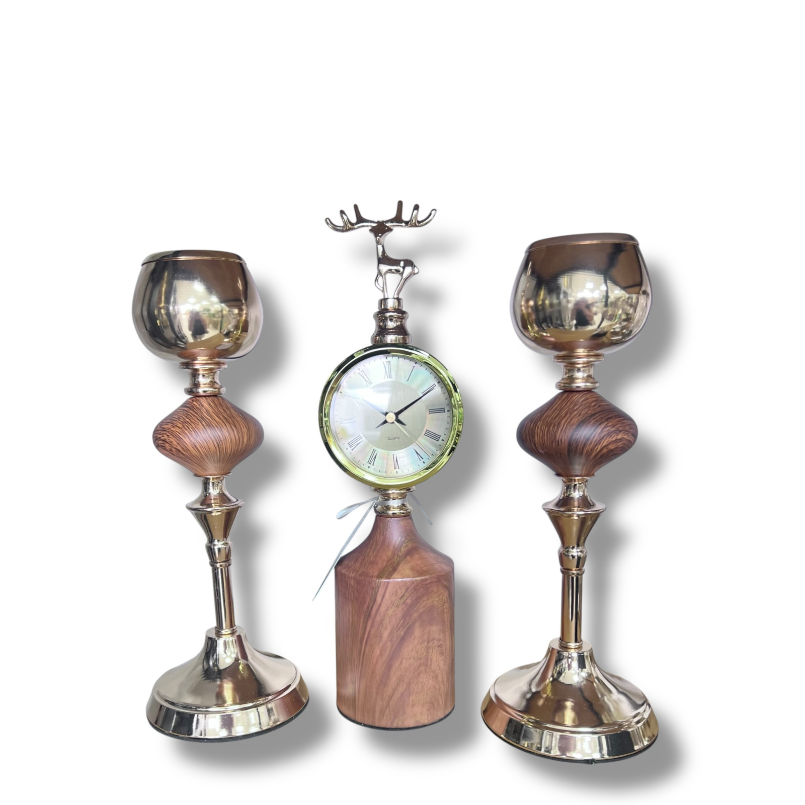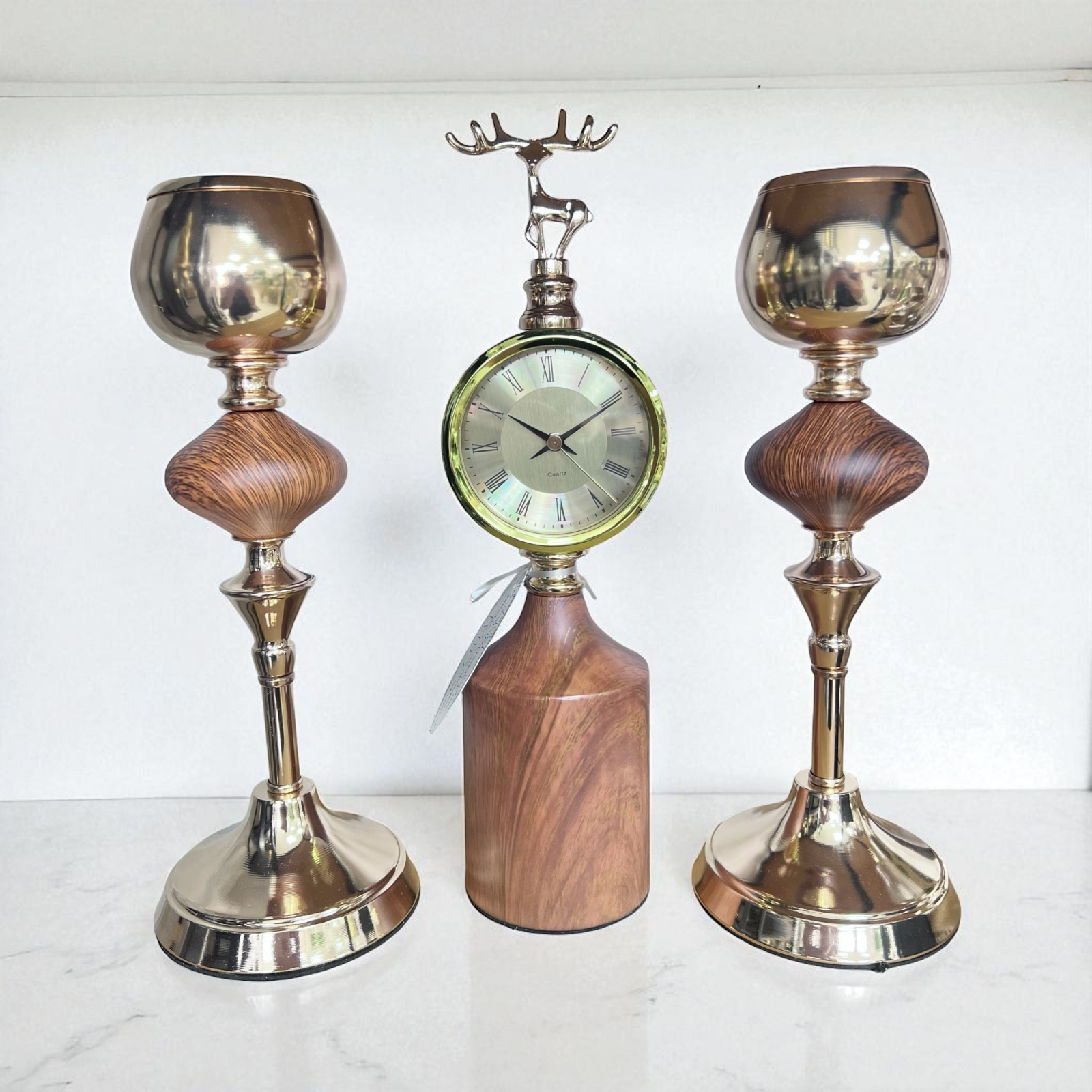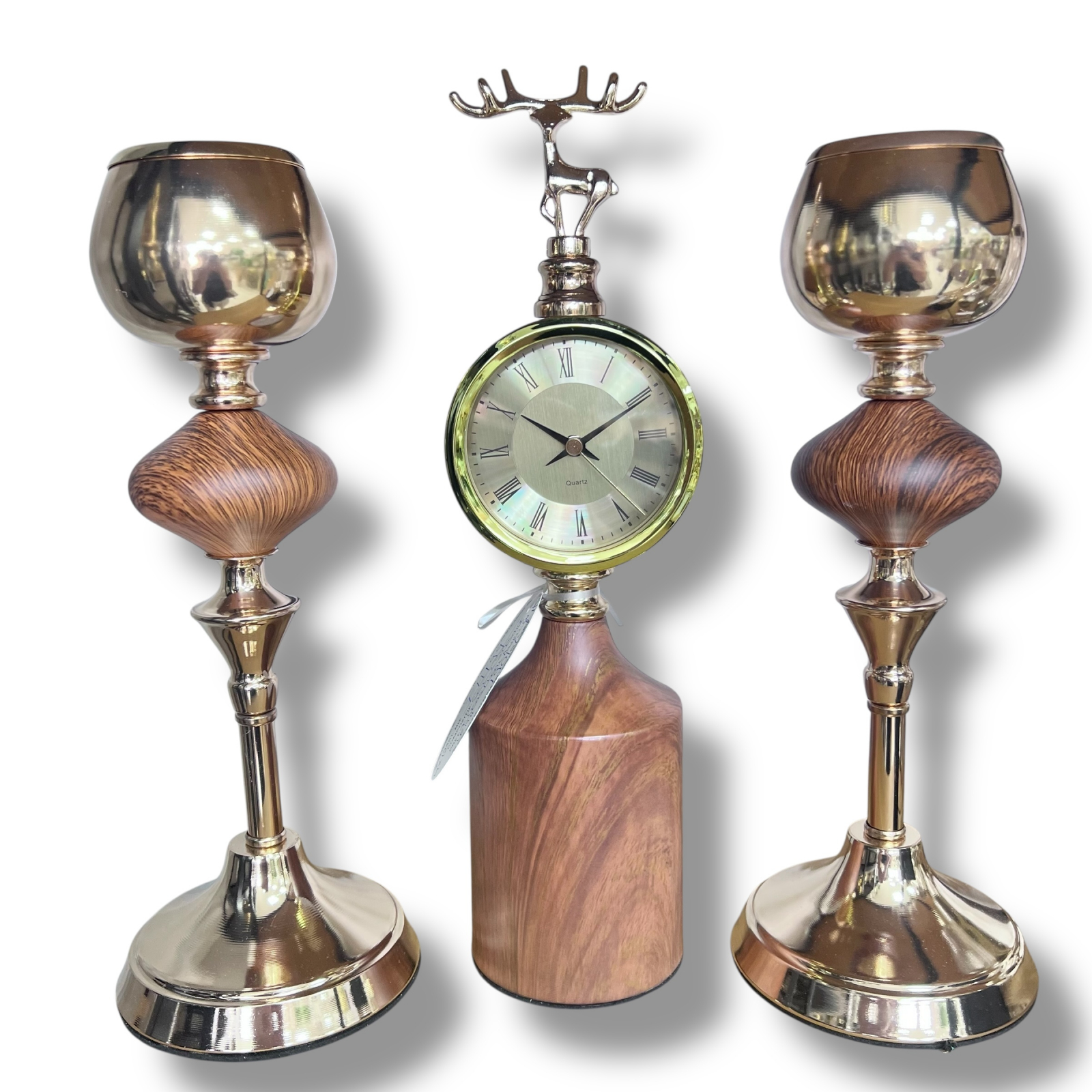 Transformă orice încăpere într-un spațiu elegant și sofisticat cu acest set decorativ premium, compus dintr-un ceas de birou/decor cu detalii de căprior și două sfeșnice metalice aurii cu accente din lemn.