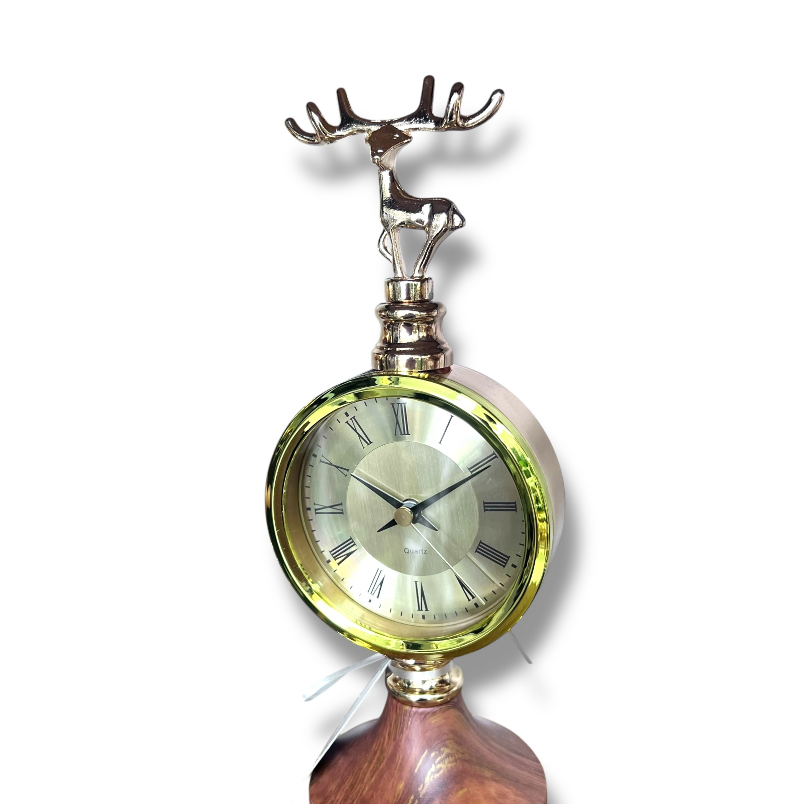 Ceasul decorativ are un design unic, cu cadran rotund cu cifre romane, finisaje aurii și o bază din lemn ce conferă stabilitate și rafinament. Deasupra tronează silueta unui căprior, simbol al grației și nobleței, detaliu care adaugă un plus de stil și originalitate.