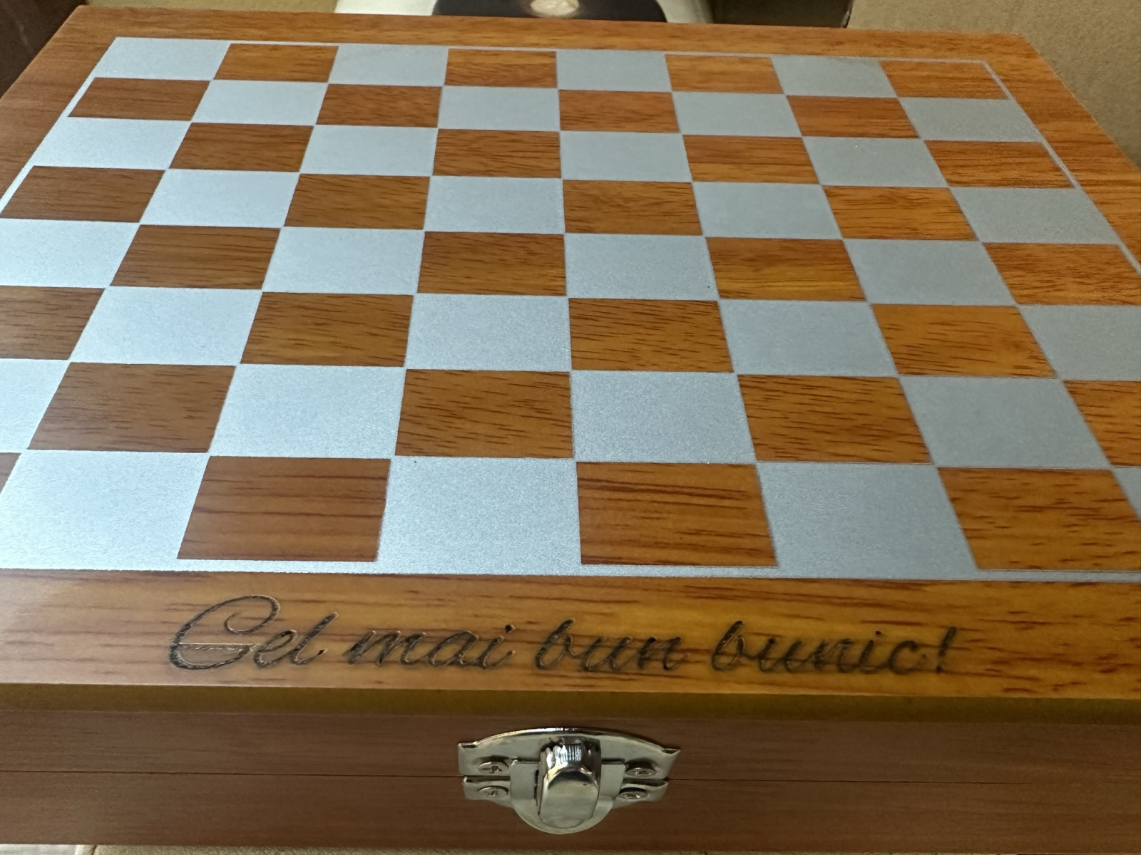 Setul cadou sah si accesoriile pentru whisky este ambalat intr-o cutie eleganta,din lemn,care prezinta pictata pe partea superioara o tabla de sah.