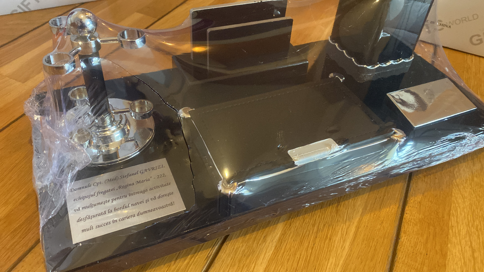 Instrumentele de scris de pe birou vor fi mereu la îndemâna posesorului, la fel şi cărţile de vizită, obiectele mici de papetărie şi indispensabilele post-it-uri, fiecare aflându-şi propriul suport, totul pentru eficienta organizare a spaţiului de lucru. Baza suportului pentru birou este realizată din lemn, în nuanţă de negru, perfect finisat şi lăcuit, aspect ce imprimă întregului obiect note clasice. Acestea se împletesc elegant cu modernitatea, sugerată de ceasul încorporat, de calculatorul solar şi de luciul argintat al suporturilor pentru cărţi de vizită şi alte accesorii de papetărie.