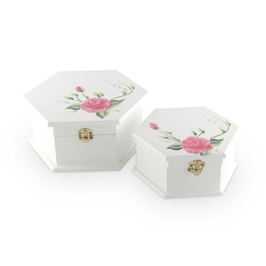 Incepand de la forma pe care o au: una octogonala, de dimensiuni diferite. Apoi modelul si modul in care au fost realizate; sunt confectionate din lemn si deosebit pictate cu un motiv floral: un trandafir delicat, simbol al perfectiunii, desavarsirii si elegantei. Culoarea petalelor, un mov cald, precum si cea a frunzelor contrasteaza impecabil cu albul imaculat al cutiei. Datorita spatiului generos pe care il ofera fiecare din ele, aceste cutii de bijuterii sunt ideale pentru pastrarea ingrijita si organizata a bijuteriilor, atat de importante pentru o femei.