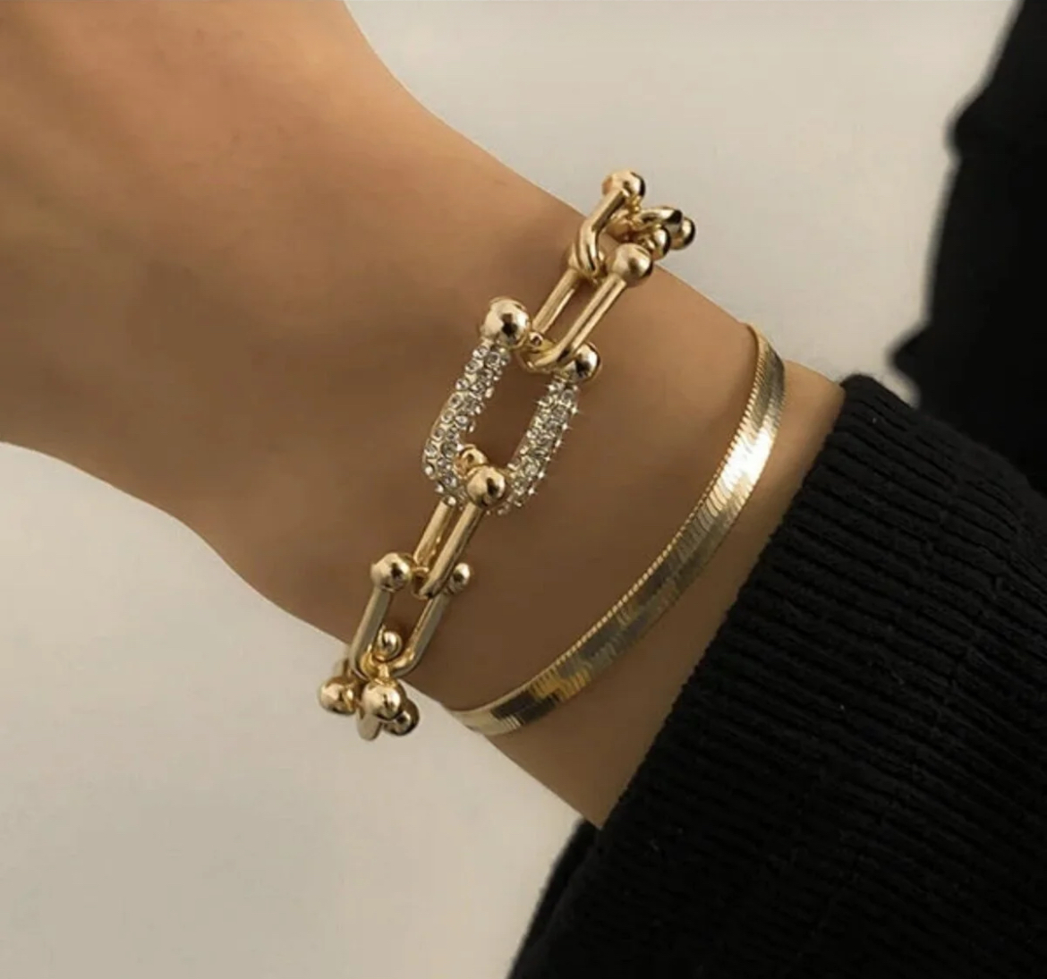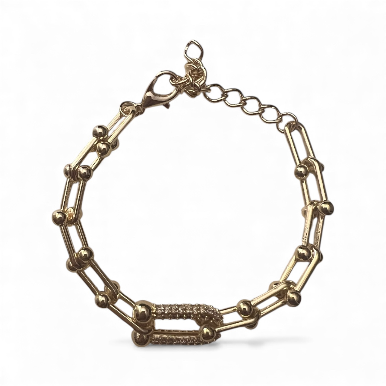 Această brățară rafinată impresionează prin designul său modern, compus din zale subțiri duble, unite prin elemente sferice decorative. Realizată din oțel inoxidabil placat cu aur galben, piesa îmbină eleganța cu durabilitatea, păstrându-și strălucirea în timp fără a se oxida.