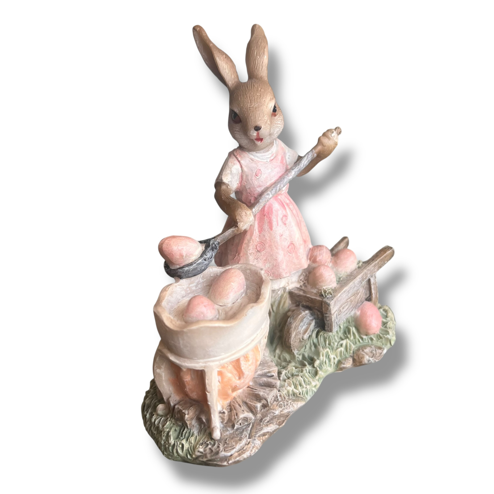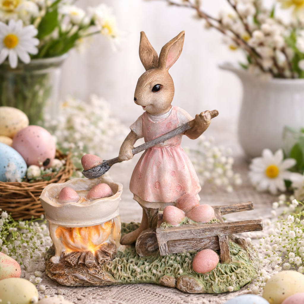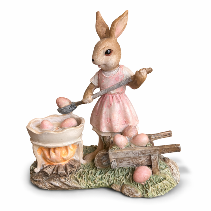 Figurina prezintă un iepuraș simpatic îmbrăcat într-o rochiță roz delicată, care pregătește ouă de Paște într-un vas aflat pe foc, folosind o lingură mare de lemn. Alături, o mică roabă rustică plină cu ouă colorate completează scena, creând o atmosferă caldă și tradițională de sărbătoare.