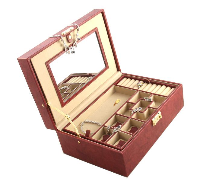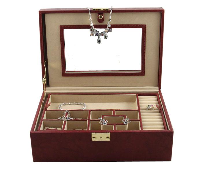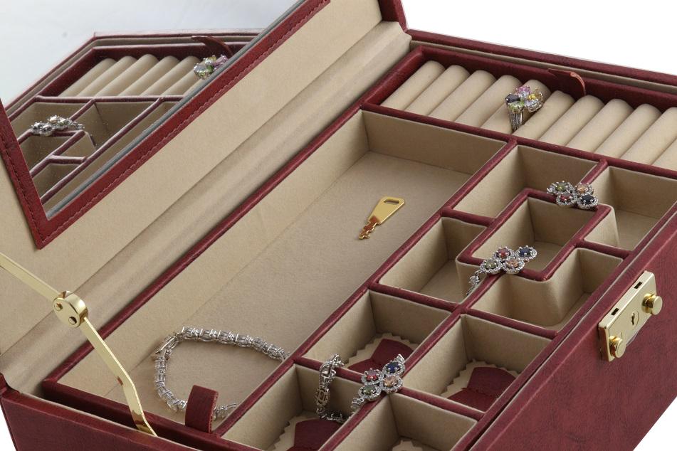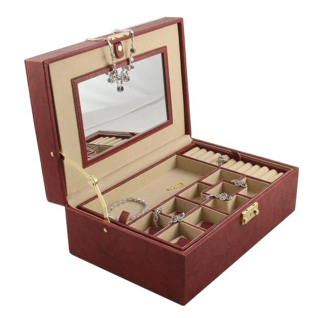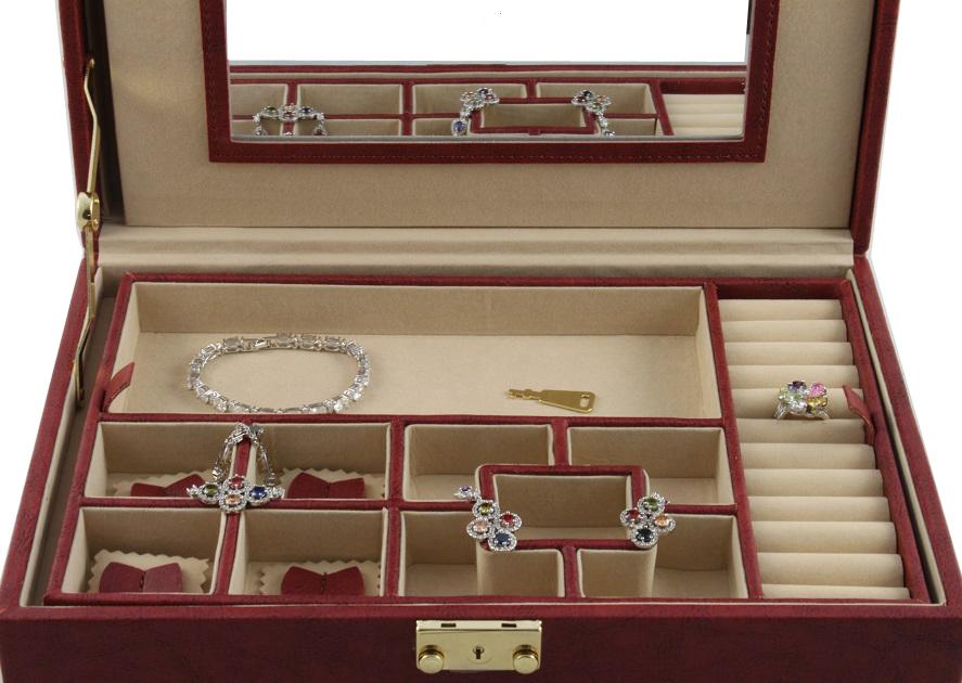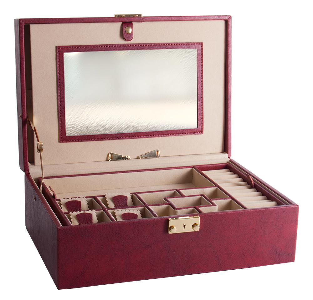 Cutie pentru bijuterii din piele rosie inchisa, un cadou femei cu interior complet imbracat in catifea moale, ideala pentru pastrarea ingrijita a accesoriilor.