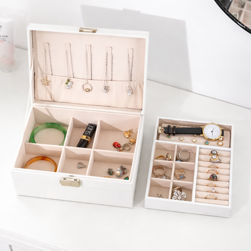 Păstrează-ți bijuteriile în siguranță și perfect organizate cu această cutie de bijuterii cu design modern și compartimentare inteligentă. Ideală pentru acasă sau în călătorii, această cutie devine rapid accesoriul esențial al oricărei femei care iubește ordinea, stilul și eleganța.