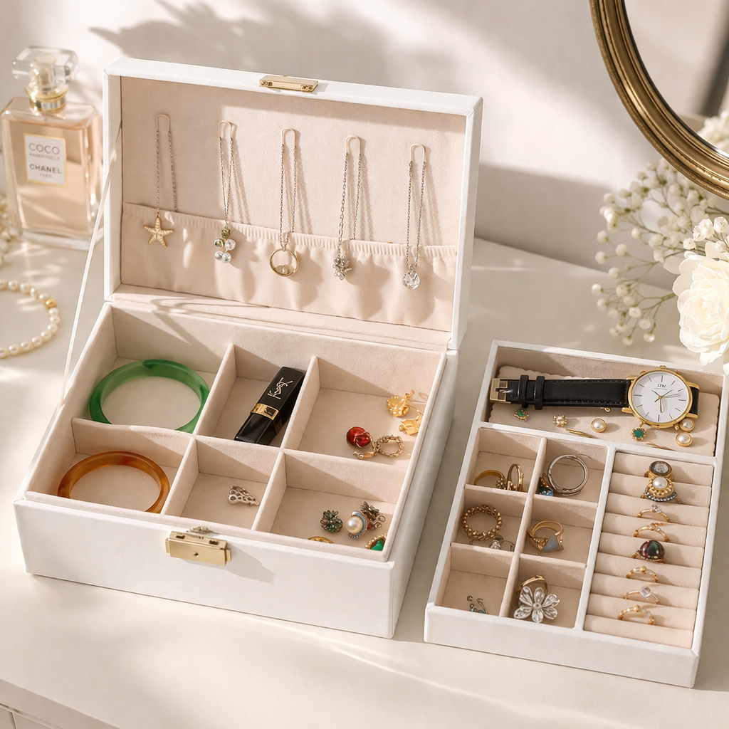 Păstrează-ți bijuteriile în siguranță și perfect organizate cu această cutie de bijuterii cu design modern și compartimentare inteligentă. Ideală pentru acasă sau în călătorii, această cutie devine rapid accesoriul esențial al oricărei femei care iubește ordinea, stilul și eleganța.