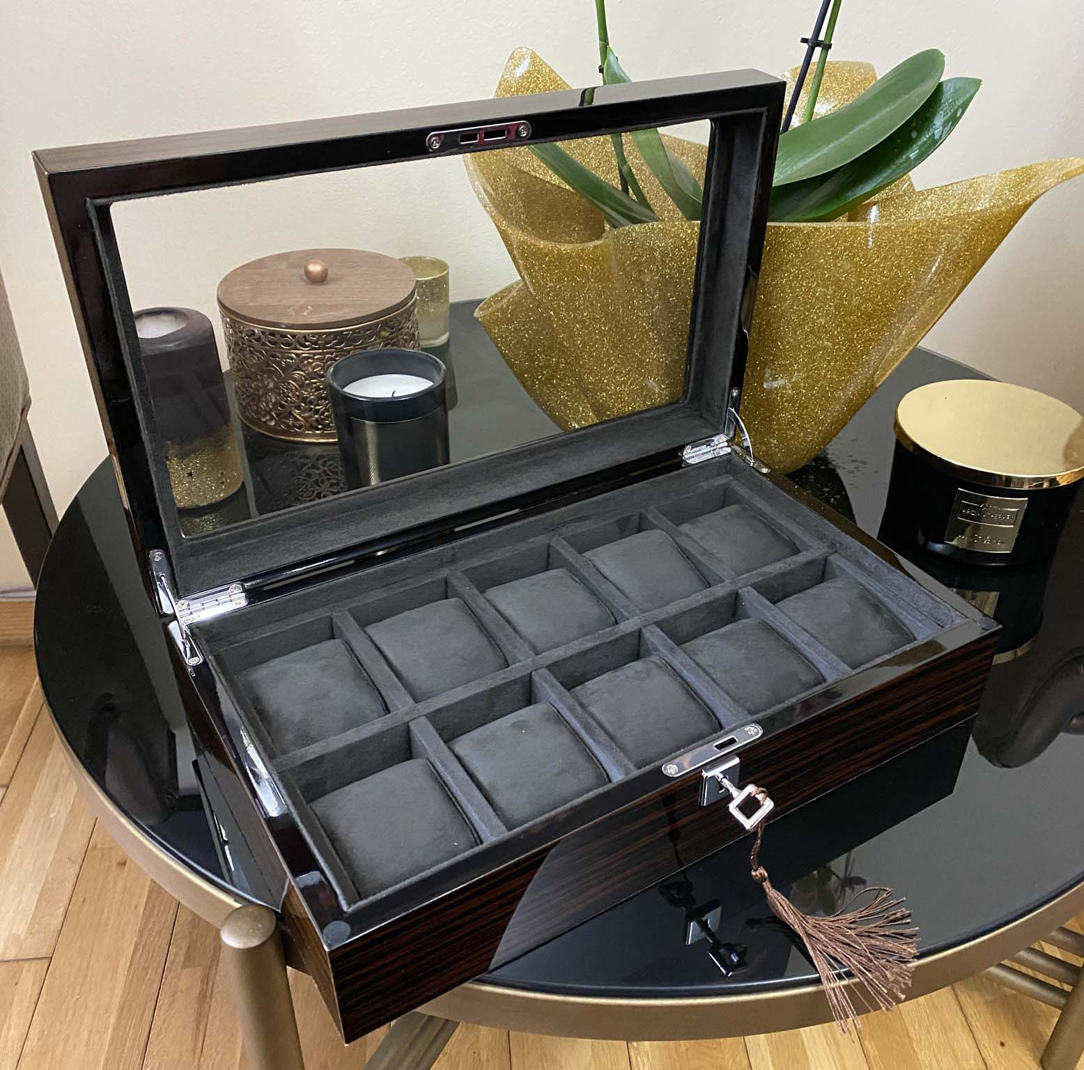 Cutia 10 ceasuri din lemn lacuit pentru cei mai pretentiosi domni.