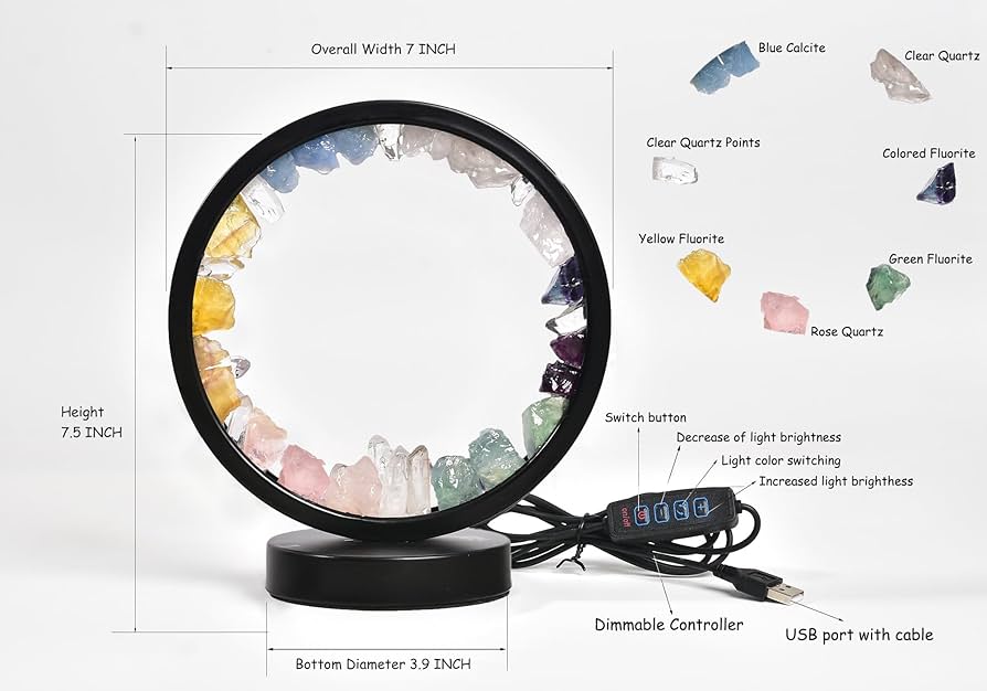 Transformă atmosfera din dormitor, birou sau colțul tău de meditație cu Lampa Chakra Crystals – o piesă modernă de decor și relaxare, realizată din pietre semiprețioase naturale, alese pentru echilibrul energetic și frumusețea lor unică.