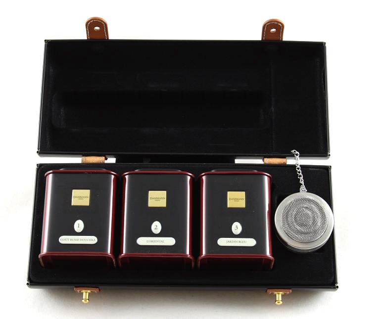 Setul de ceai  Dammann Leather Tube este alcătuit dintr-o cutie elegantă din tablă cu două bretele din piele, un infuzor şi trei recipiente metalice cu câte 30 de grame de sortimente de ceai.
