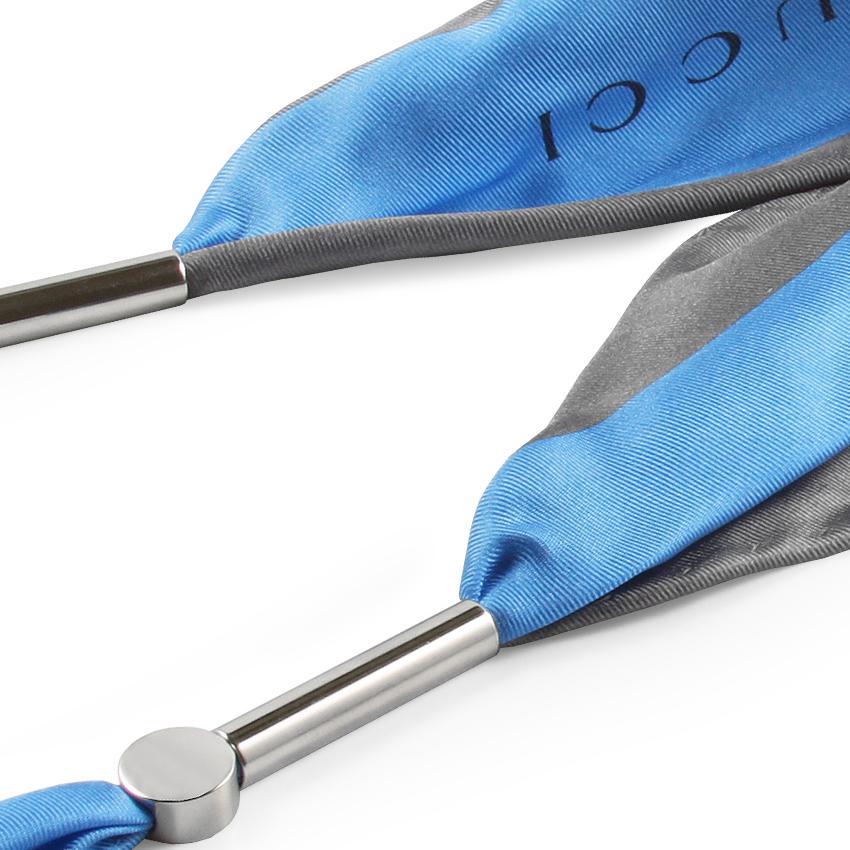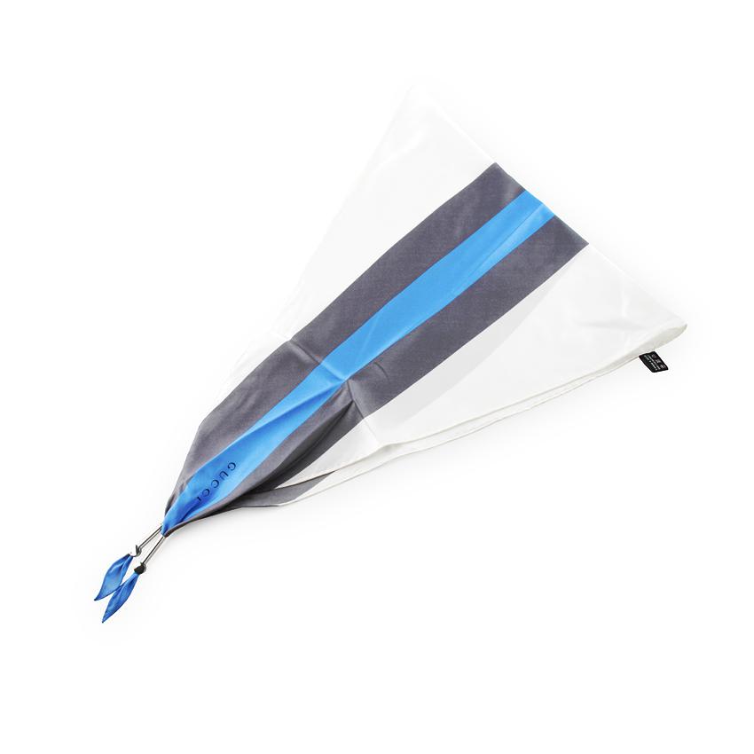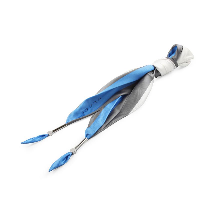 Esarfa Elegance denota o anumita distinctie, prin dungile sale inegale, in culori intr-o asociere inedita: albastrul cerului contrasteaza de minune cu albul imaculat si cu nuanta de gri-petrol. In plus, forma sa este si mai originala: un romb care are colturile din capat stranse cu doua minunate elemente din metal argintat. Un cadou pentru o femeie careia ii place sa iasa in evidenta printr-un accesoriu de calitate!